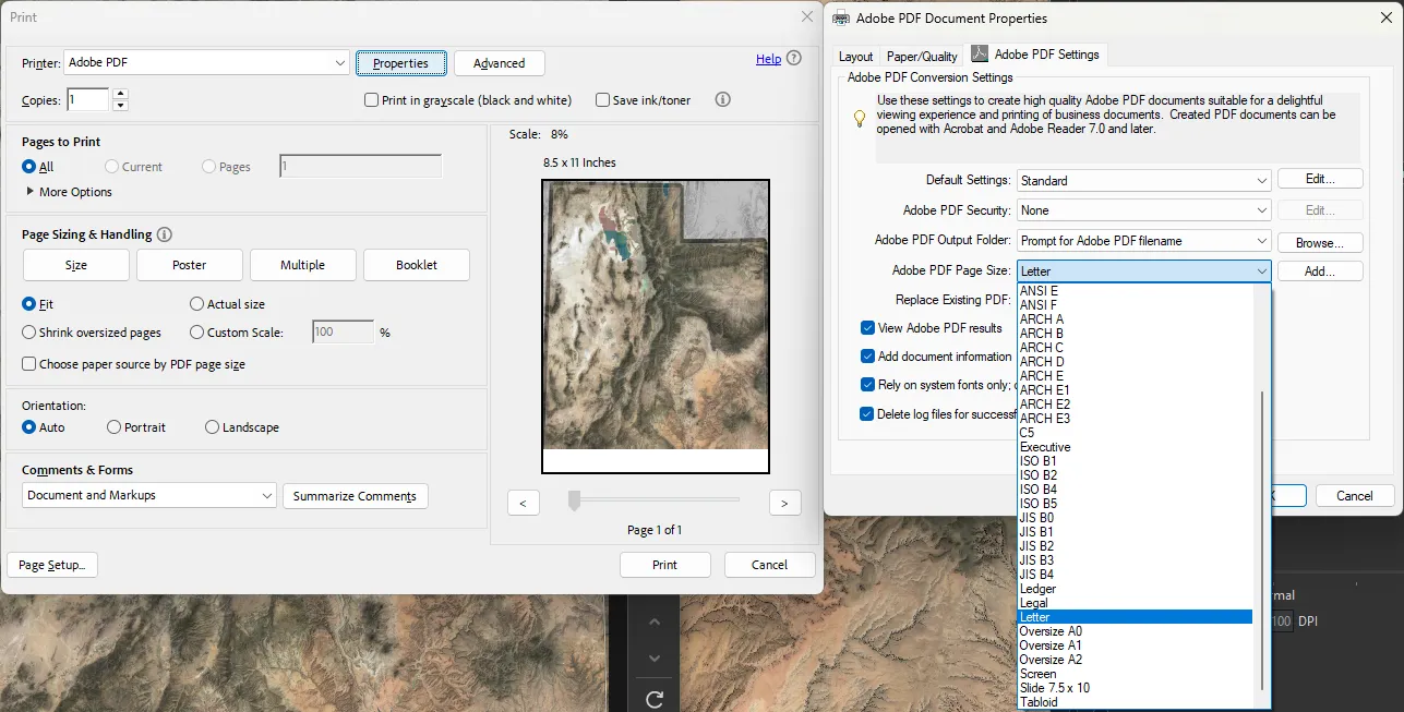 Once you’re in the print dialog, select “Adobe PDF” as the printer then select “Properties.” Go to the “Adobe PDF Settings” tab and select your desired output size in the “Adobe PDF Page Size” dropdown. If you need a custom size not listed, you can click “Add…” to add your new page size to the dropdown list. Now you can hit “Print” and it will ask you where to save a new PDF at your desired size.