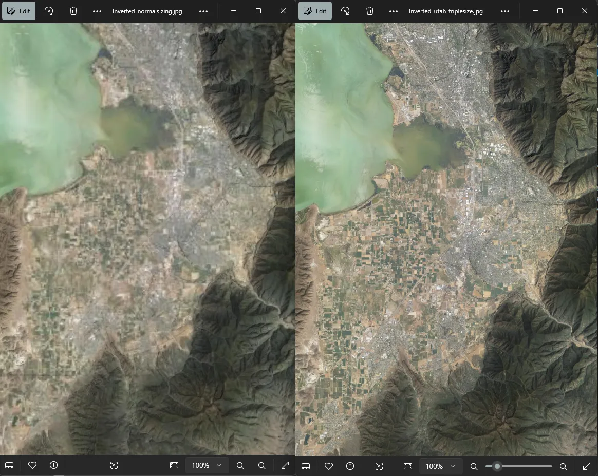 This is confirmed when you compare the two images side by side. The scaled-up version has much clearer imagery consistent with what we’d expect from panning around in the map view.